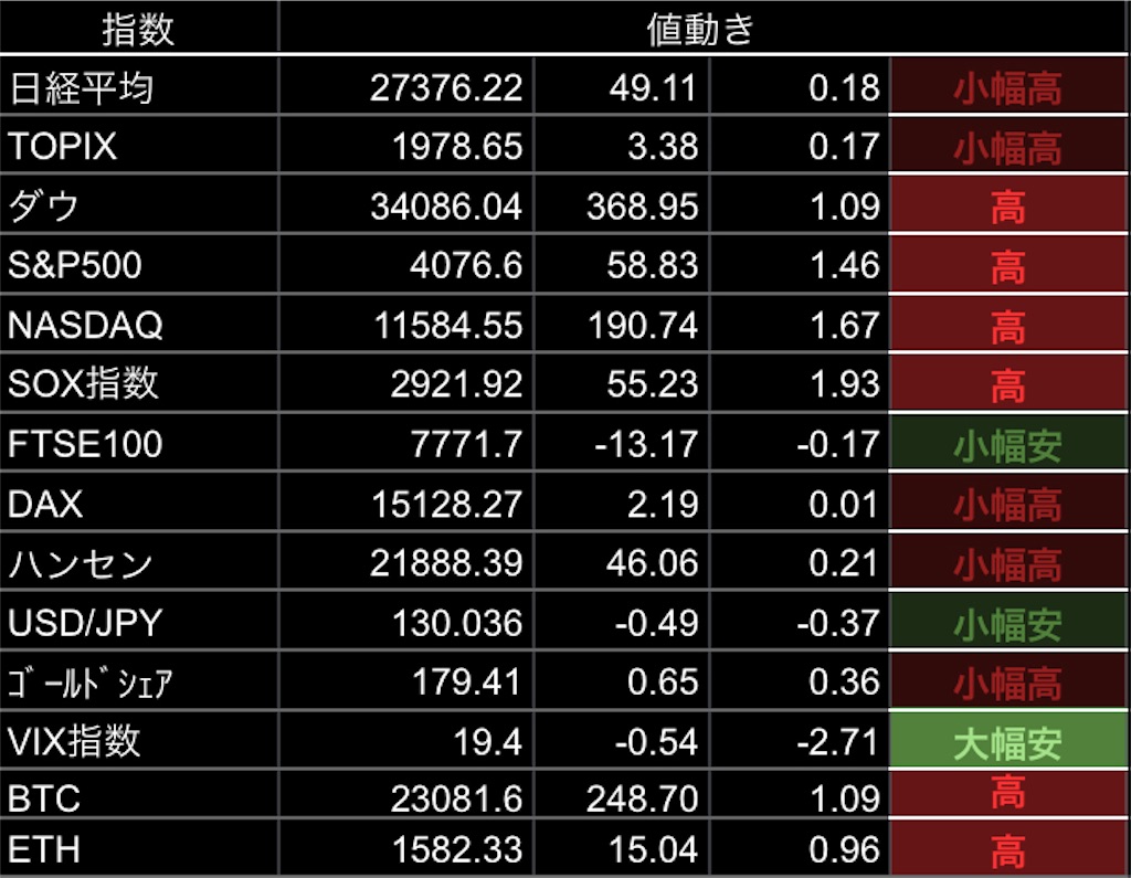 本日のモーニング相場チェックです。 1分間で大体の相場を俯瞰してみます。