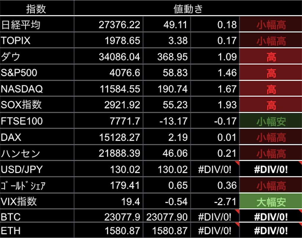 本日のモーニング相場チェックです。 1分間で大体の相場を俯瞰してみます。